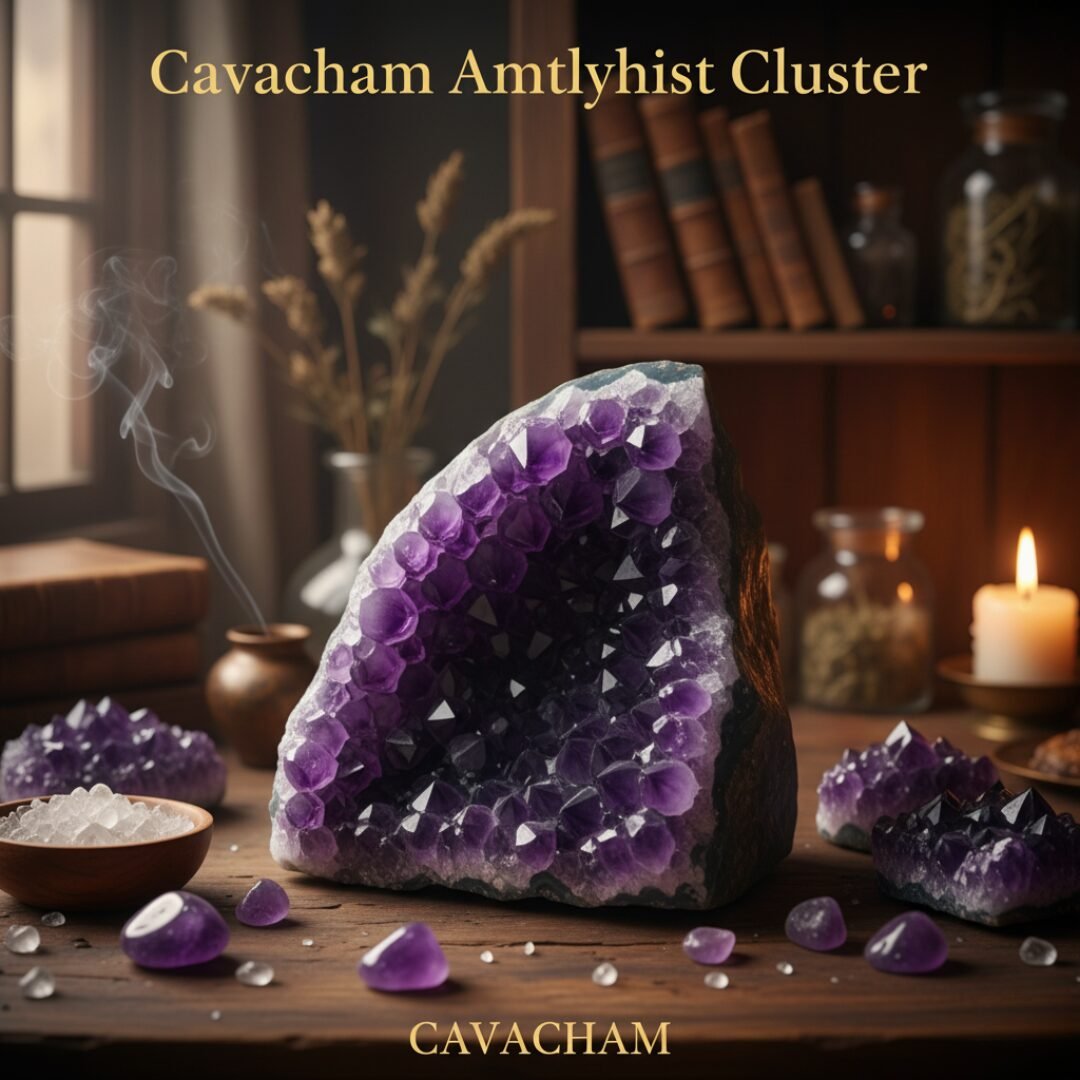 A soothing Cavacham Amethyst Cluster for peace, intuition, stress relief, and energy purification — perfect for meditation, sleep, and home harmony.
