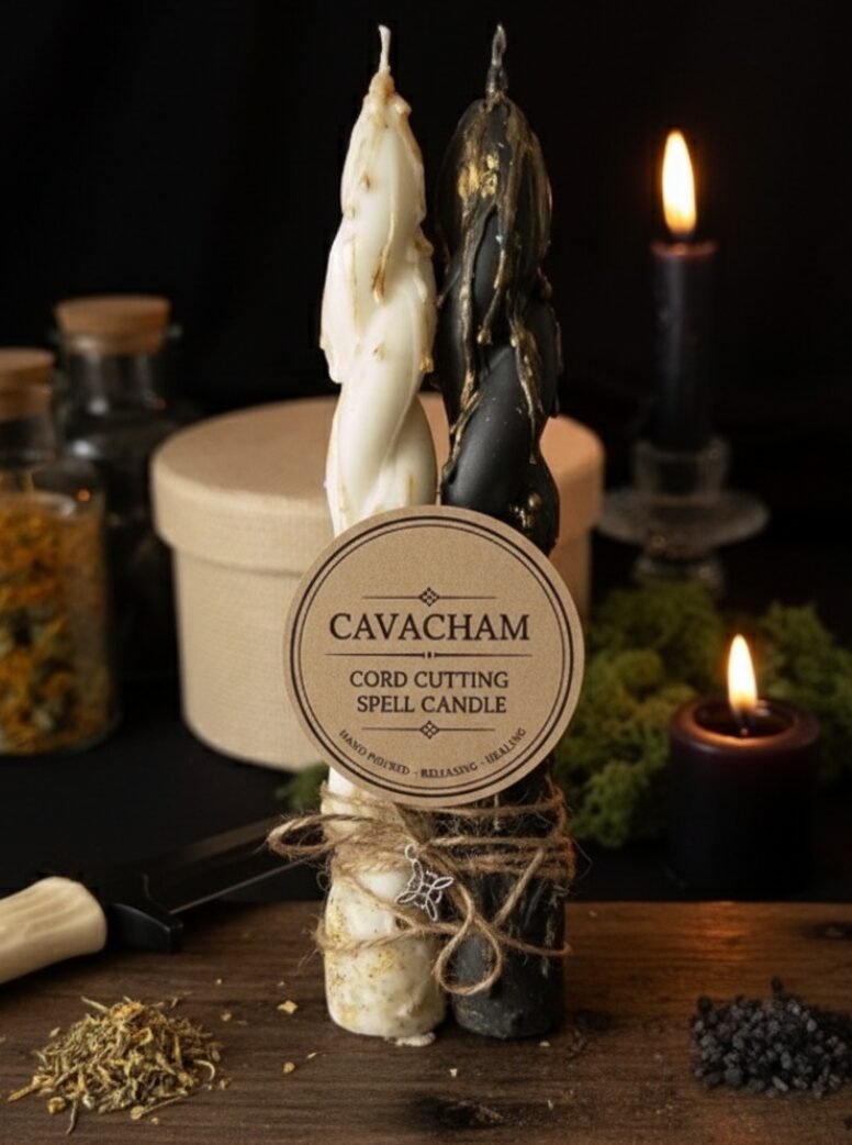 A Cavacham Cord Cutting Candle to release negative attachments, cleanse energy, and promote emotional freedom. Ideal for rituals, meditation, and intention-setting practices.
