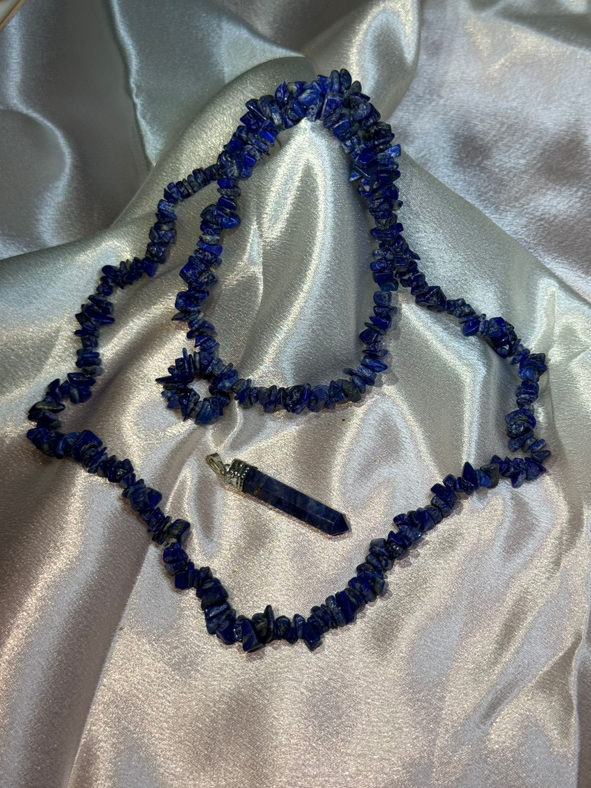 A natural Cavacham Lapis Lazuli Uncut Mala for wisdom, intuition, Third Eye & Throat Chakra activation, and spiritual growth. Ideal for daily wear and meditation.